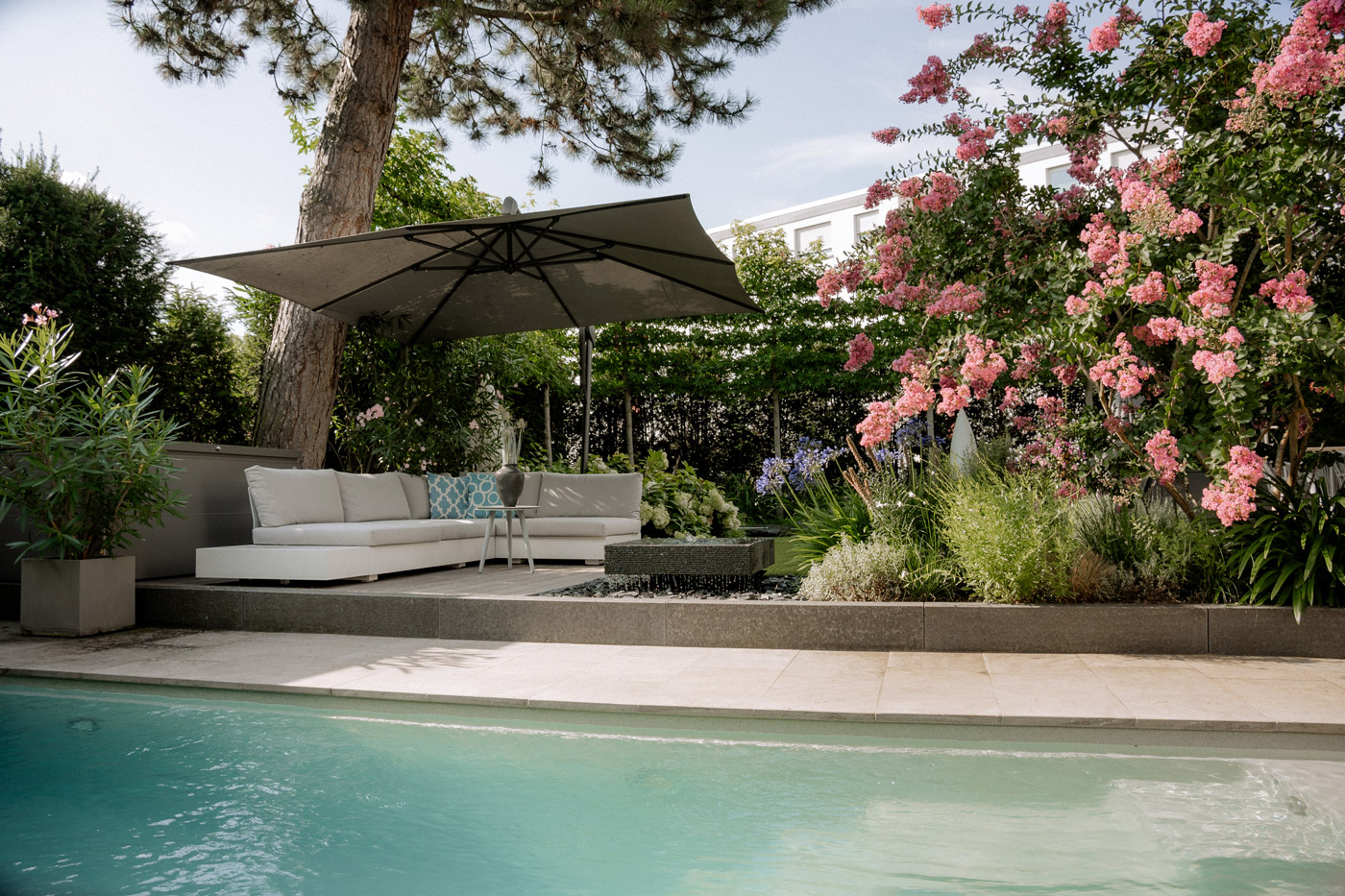 In dieser harmonischen Poollandschaft vereint sich klares Wasser mit einer geschmackvollen Vielfalt an Pflanzen. Blühende Sträucher und grüne Akzente schaffen eine Atmosphäre der Ruhe und Eleganz. Der perfekte Ort, an dem Natur und Luxus in perfektem Einklang miteinander verschmelzen.